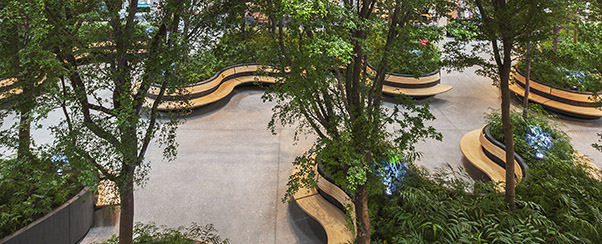 Høje træer, øer af grønt, plantereoler og ampelplanter, der ’vælter’ ud over balkonerne. Et træ, der går igennem en bordplade og skaber en paraply at sidde og arbejde under.